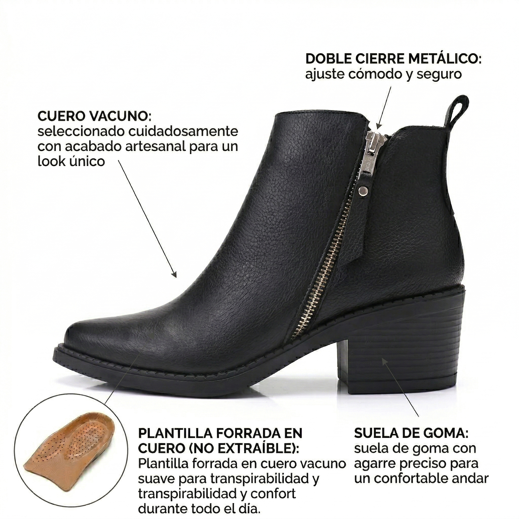 Confeccionada en cuero de tacto excepcional, es liviana, cómoda y sumamente flexible. Su doble cierre la hace práctica y fácil de calzar. Altura justa de 5 cm para un look sofisticado y versátil. Base de goma para mejor adherencia. Forrada completamente en cuero para mayor confort.
