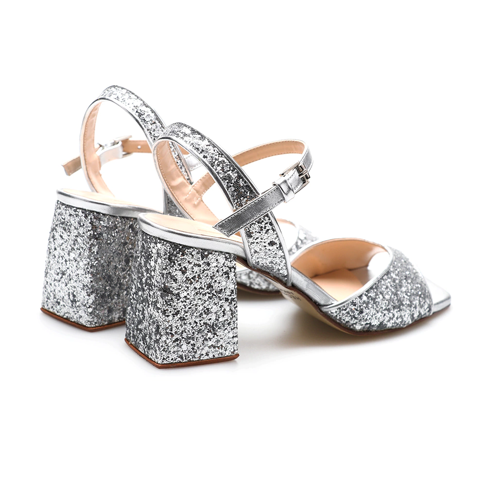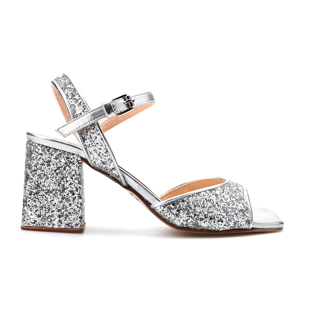 GLOW: Sandalia confeccionada en cuero glitter. Forrada en cuero. Sobre base artesanal de suela. Es ideal para fiesta.