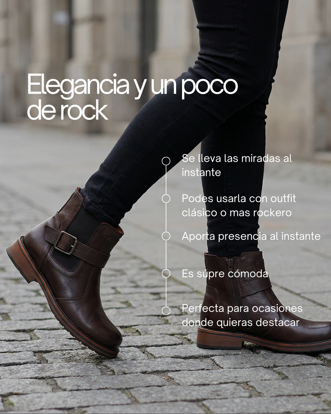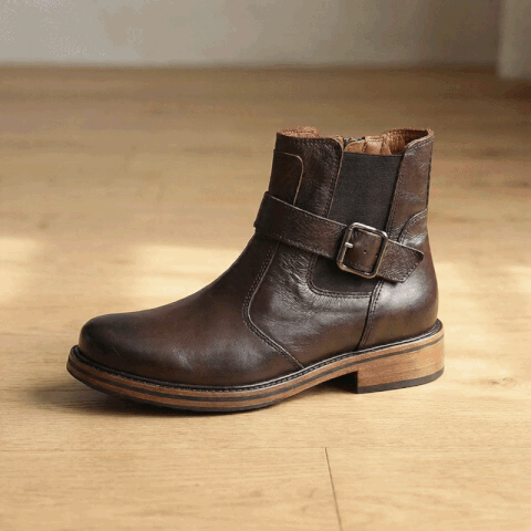 Confeccionada totalmente a mano en cuero vacuno con efecto bi tonal, incorpora elástico y cierre lateral para un calce perfecto. Forrada en cuero y adornada con hebilla, su base artesanal de suela y suelín de goma antideslizante garantiza comodidad y adherencia excepcionales además de un look único.