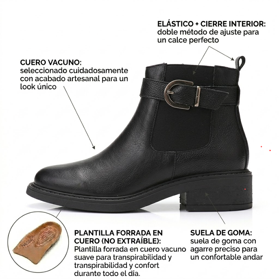 La Bota Jaddy está confeccionada en cuero levemente graneado que aporta textura y elegancia. Posee cierre lateral y elástico para facilitar el calce, además de una hebilla decorativa. Su base de goma es flexible y liviana, con horma redondeada para máxima comodidad.
