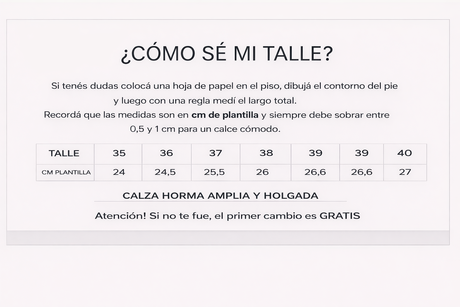 Horma: Amplia, calza un número más. En caso de esatr entre dos talles llevar el más chico. o consultar por mail a [email protected]