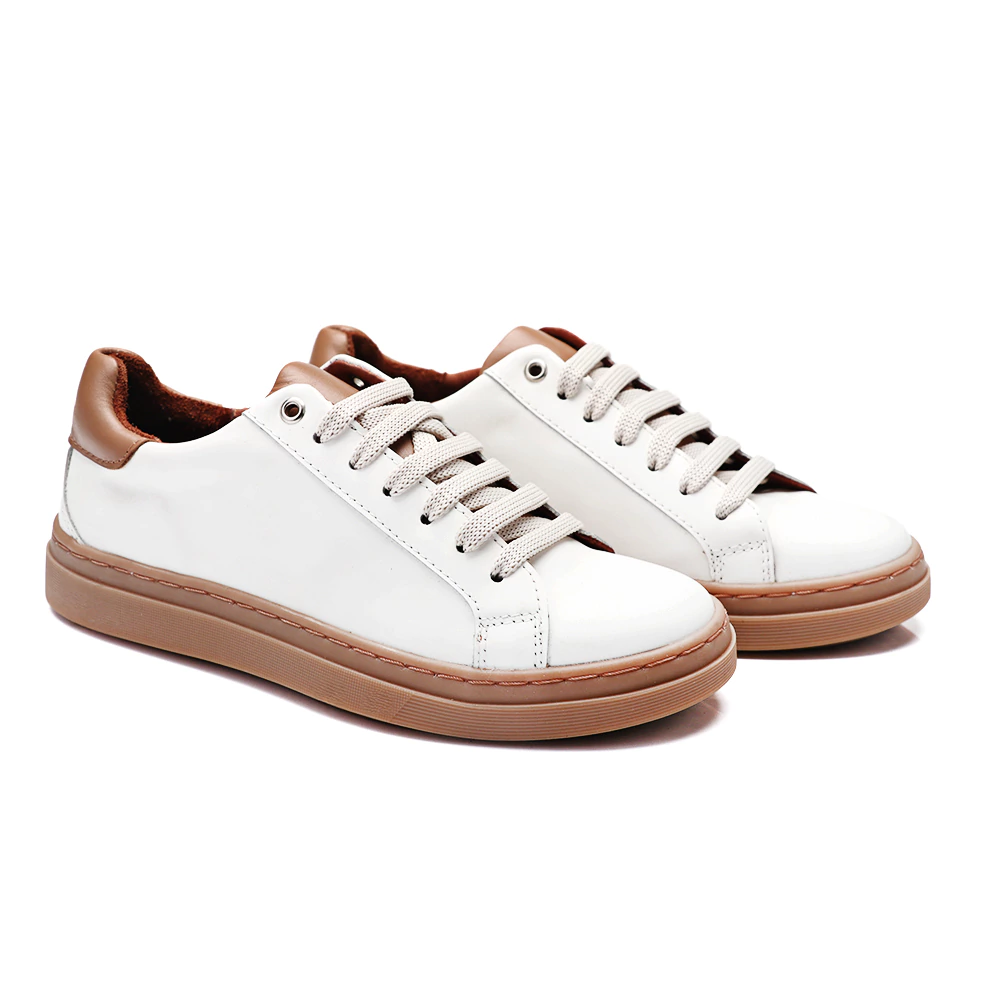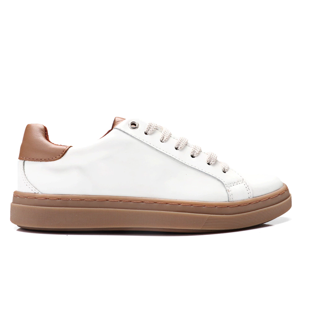 Roma (Crudo): Zapatilla urbana confeccionada en cuero liso de alta calidad, combina dos colores para un look moderno y versátil. Su base en tono caramelo se adapta fácilmente a distintos estilos y colores. Lengüeta y talón acolchados brindan confort excepcional. Es liviana y su base de goma garantiza excelente adherencia. Ideal para quienes buscan comodidad y elegancia en cada paso.