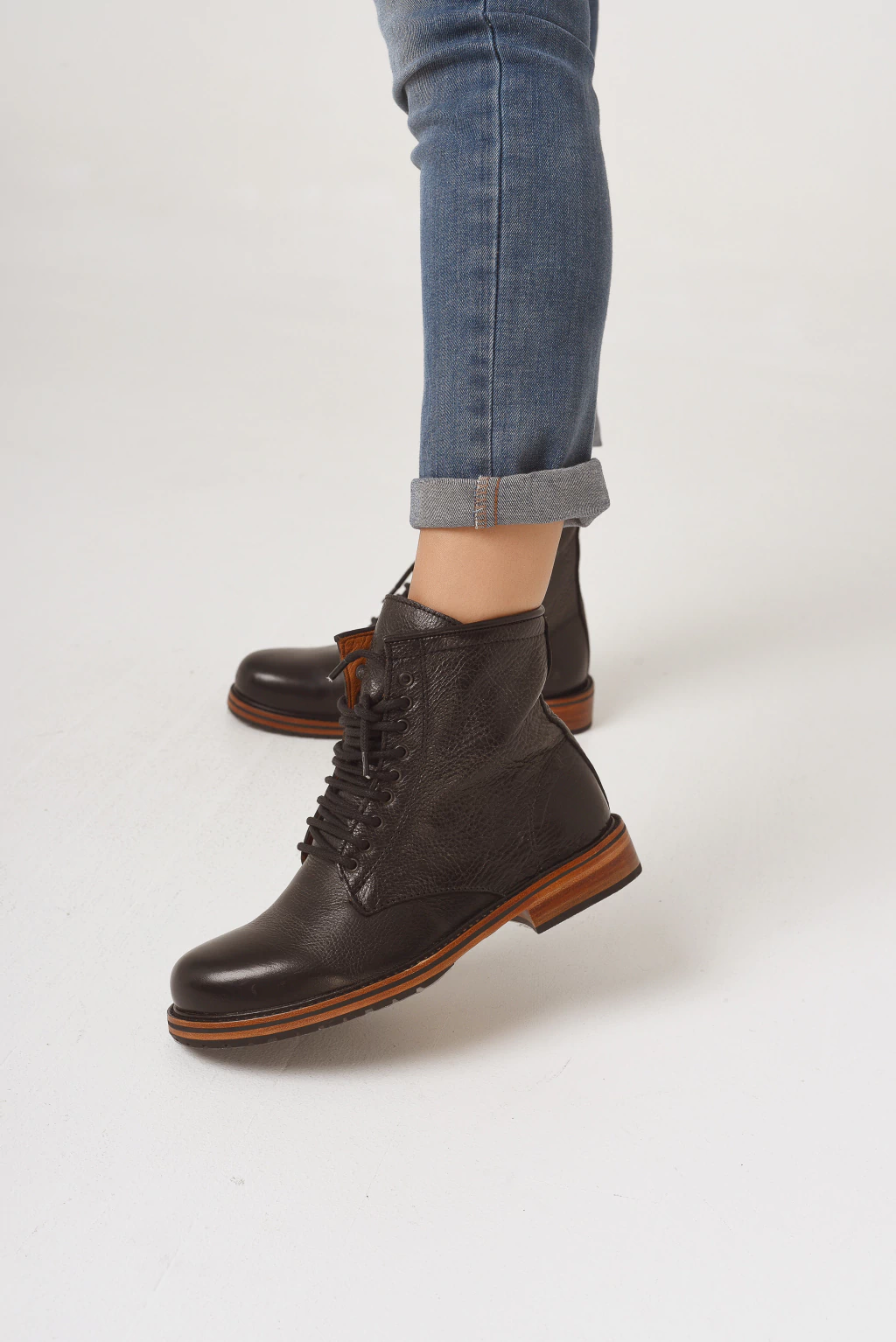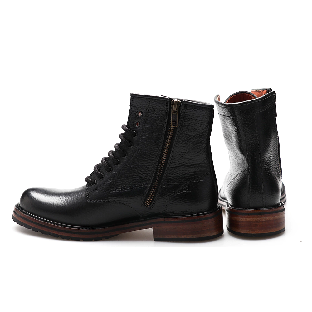YORK: Es un borcego confeccionado en cuero vacuno levemente graneado. Forrado en cuero. Posee cierre interno que favorece el calce. Lo más destacado del borcego es su base completamente artesanal de suela con entre suela de goma y terminación con en goma de caucho ruta, lo que le provee una buena adherencia al suelo además de volverlo muy resistente.